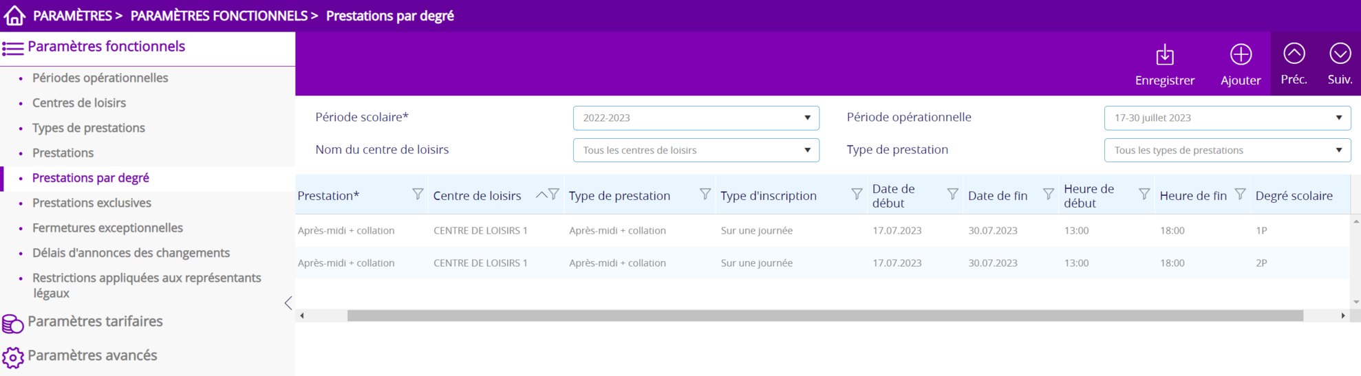 Cet écran permet de limiter l'accès aux prestations selon le degré scolaire de l'enfant lors de l'inscription en ligne.